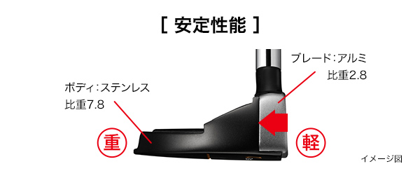フェース側に軽比重のアルミ、ボディ側には重比重のステンレスを組み合わせるという、異素材の比重差を活かした「シルバーブレード構造」が進化。深重心化がすすみ、強いラインでよく転がるので(カップまで届かない、打てない)悔しいミスを未然に防いでくれる。細部までこだわったヘッドデザイン、目標方向に対するアライメント効果も大きく、構えやすさも抜群。