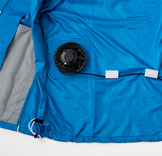 背面腰部2か所のファンから外気を取りこみ、衣服内の暖かく湿った空気を襟元と袖口から排出する構造。